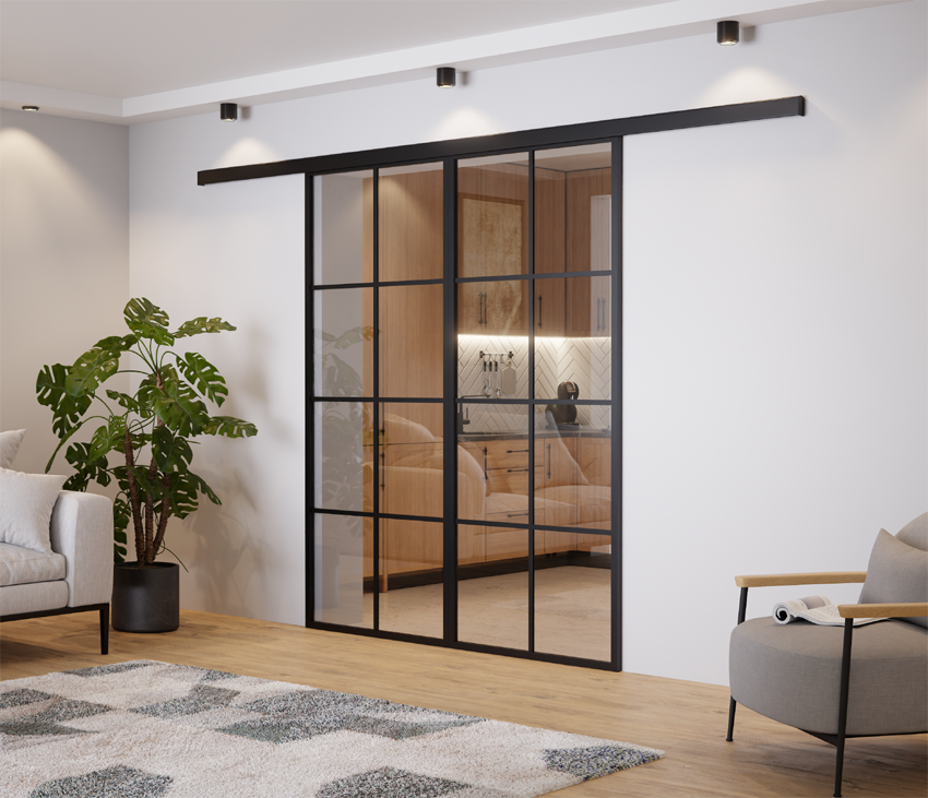 DRZWI PRZESUWNE PODWÓJNE ALUMINIUM CZARNE (Montaż do sufitu) LAGUNA
