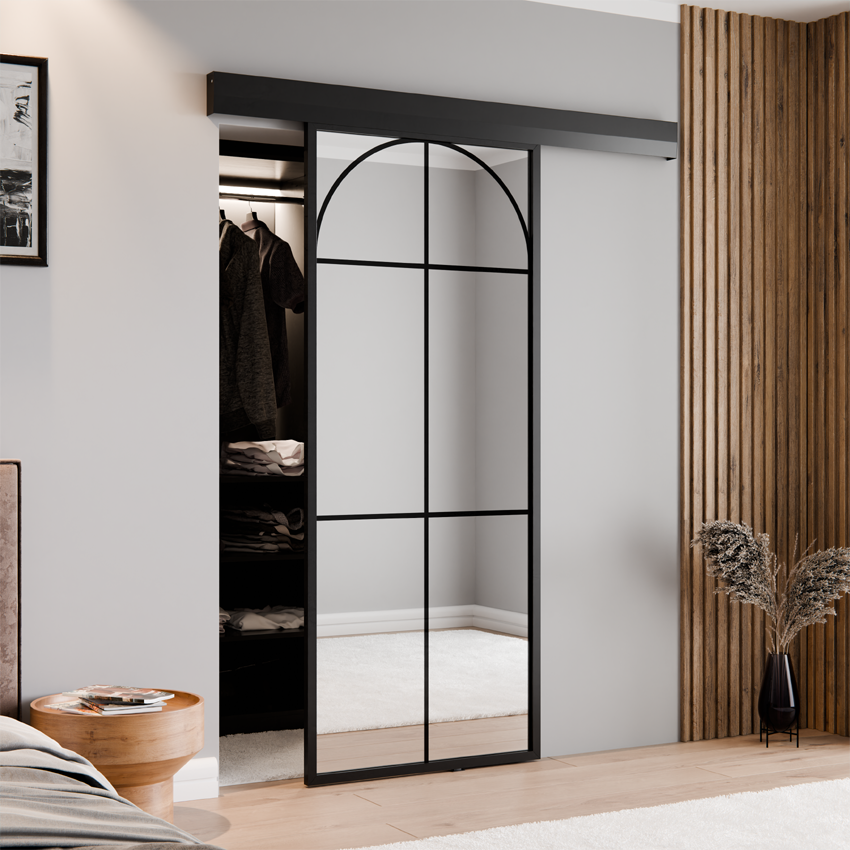 DRZWI PRZESUWNE ALUMINIUM CZARNE LUSTRO SREBRNE ŁUK 2 THOR